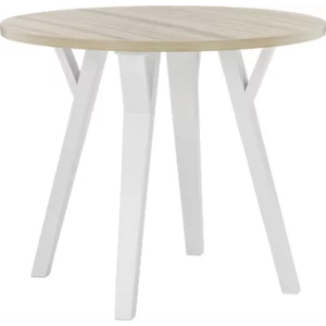 Bring light to your dining area with clean lines and a bright two-tone finish. The round dining table sports stylized saber legs in a white finish for beautiful simplicity. The melamine top in a light tan color provides additional durability, marrying minimalism with big style for a delightful combination.