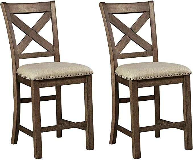 This upholstered dining chair elevates the art of casual rustic style. With a distressed nutmeg finish, antiqued nailhead trim and textured polyester fabric, this upholstered dining chair with classic X back styling entices with warmth and earthy elegance. Cushioned seat accommodates lingering meals enjoyed in comfort.