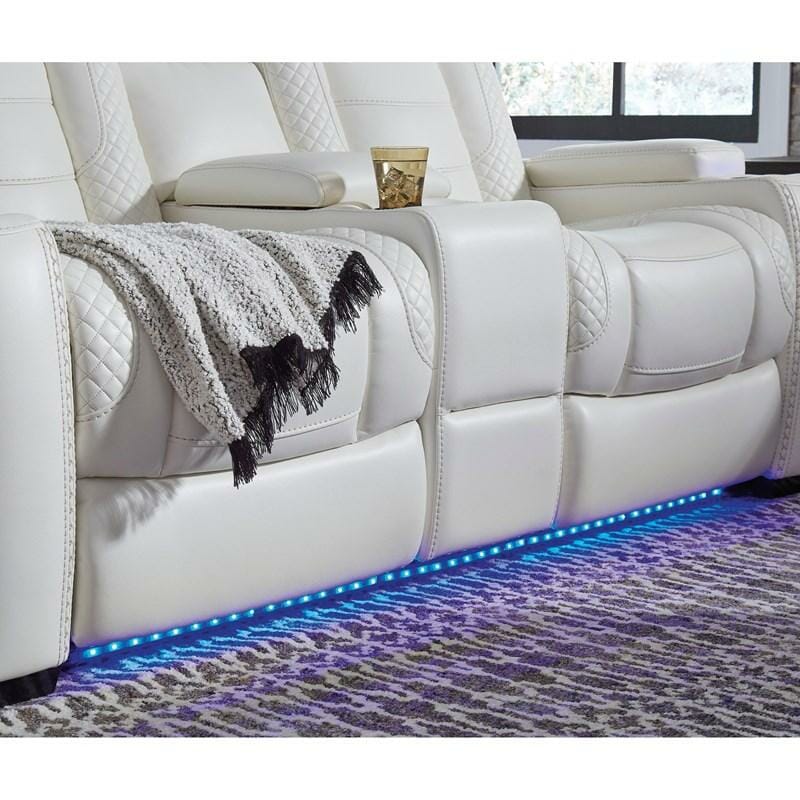 This power reclining loveseat takes its cue from luxury automobiles with lattice and crosshatch stitching, for a richly tailored aesthetic that gives you plenty of reasons to celebrate. Sumptuously padded cushions and crisp white faux leather upholstery add to the indulgence. When it’s time to rev up the action, the dual reclining bucket seats, Easy View™ power adjustable headrests, LED accent lighting and center console with docking station keep you in the driver’s seat.
