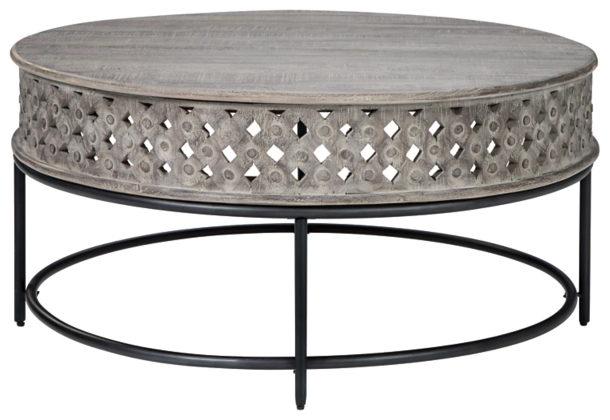 This round end table is reserved for those carving out a cool, eclectic aesthetic. Elements of this distinctive table crafted with India mango wood include hand-carved aprons forming an open lattice weave. Metal frame in matte black is a striking complement to the tabletop’s burnished gray finish.