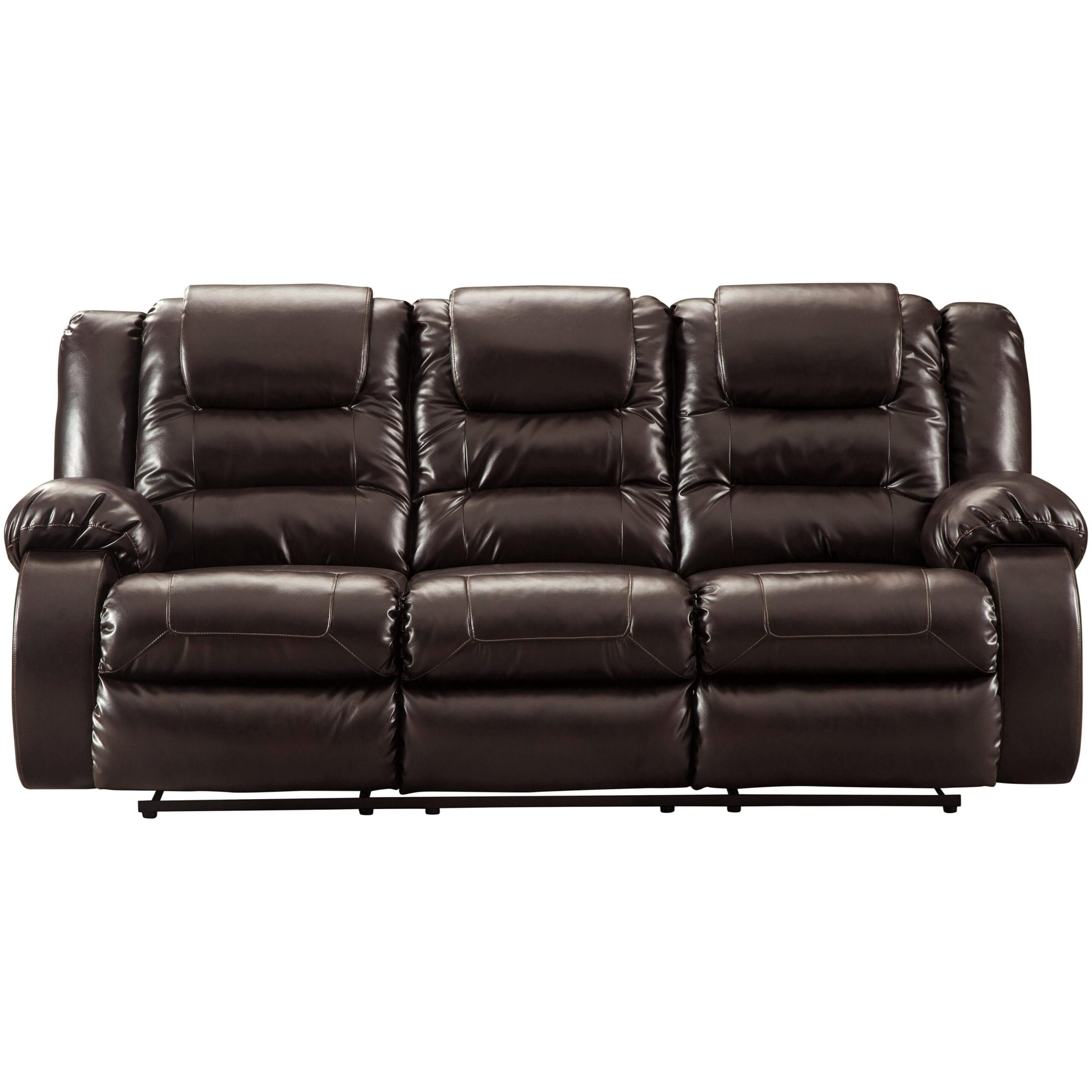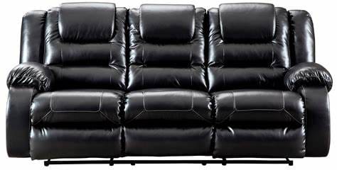 When it comes to comfort, style and value, this faux leather reclining loveseat in black rocks. Tailored for feel-good flair, its fashion-forward bustle back design is enhanced with sculpted padding on the headrest for cradling support. Channel cushioning along the sides flows into thick, wrapped pillowtop armrests that are truly over the top. And while it might look like you broke the bank, a sumptuously soft leather-like fabric keeps indulgence well within budget.
