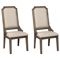 Inspired by heavy and hearty lodge-style furnishings from days gone by, this dining room upholstered chair brings the past brilliantly into the present. Enticing with a distressed aged pine color finish with light wire-brushed texture, this richly styled dining chair with bent slat design and textural beige upholstery is reserved for those who appreciate furniture with great presence.